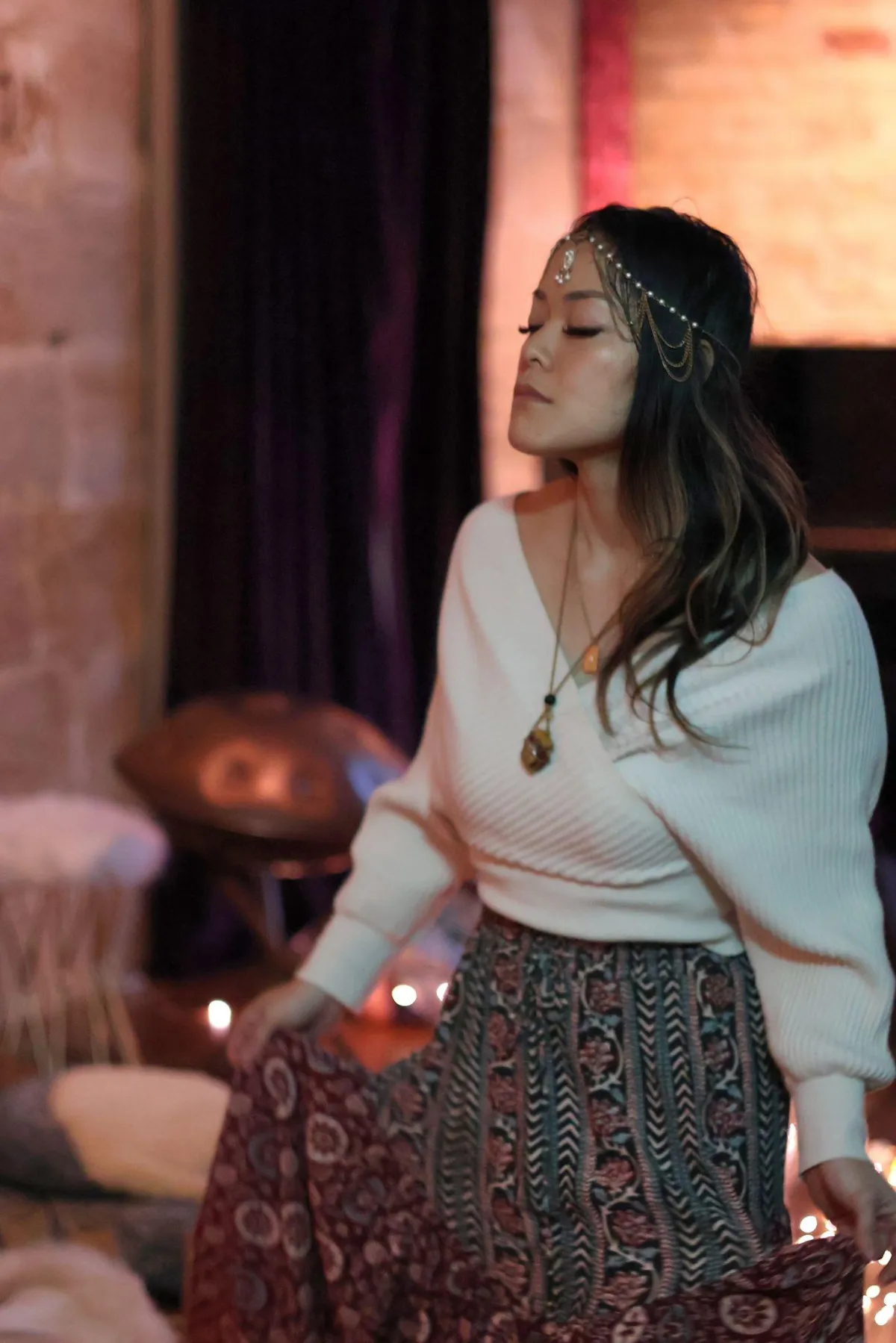 Then, you’ll be invited to lie down and receive a live sound journey. Using the healing frequencies of handpan, crystal singing bowls and other vibrational instruments, I create a sensory experience that helps regulate the nervous system, quieten internal noise, and deepen your connection to your inner world.